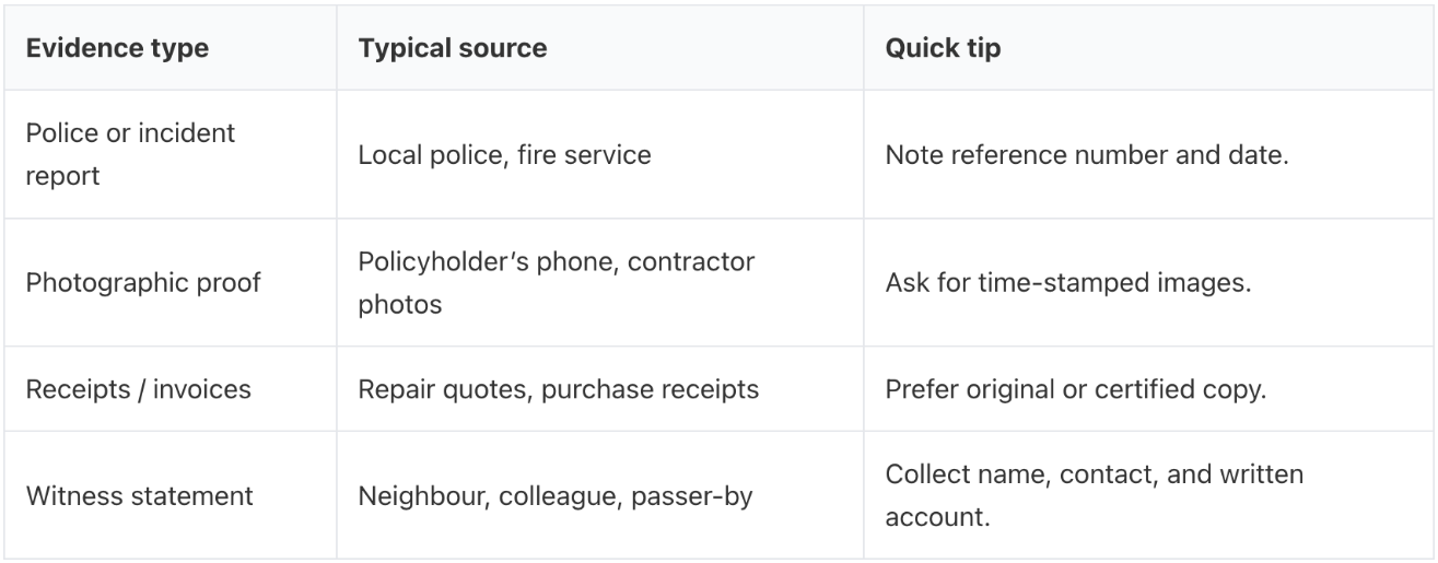 When any of those pop up, your job shifts from “record‑keeper” to “detective”. You’ll start gathering evidence that stands up to scrutiny. The Insurance Very Good guide breaks down the evidence most UK insurers expect: official reports, timestamped photos, receipts, and witness statements.